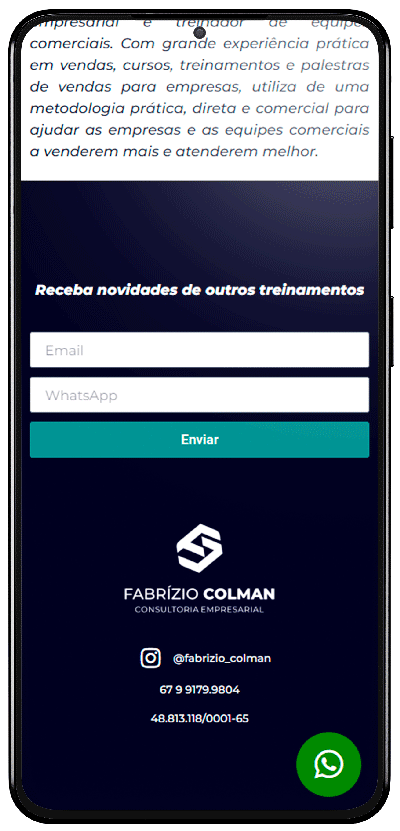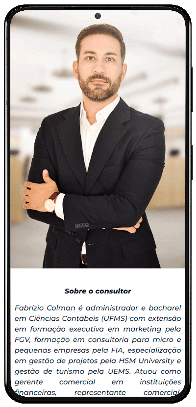 Fabrízio Colman é administrador e bacharel em Ciências Contábeis (UFMS) com extensão em formação executiva em marketing pela FGV, formação em consultoria para micro e pequenas empresas pela FIA, especialização em gestão de projetos pela HSM University e gestão de turismo pela UEMS. Atuou como gerente comercial em instituições financeiras, representante comercial, vendedor, gerente de marketing, gerente comercial, instrutor de cursos profissionalizante por 10 anos, consultor empresarial e treinador de equipes comerciais. Com grande experiência prática em vendas, cursos, treinamentos e palestras de vendas para empresas, utiliza de uma metodologia prática, direta e comercial para ajudar as empresas e as equipes comerciais a venderem mais e atenderem melhor.
