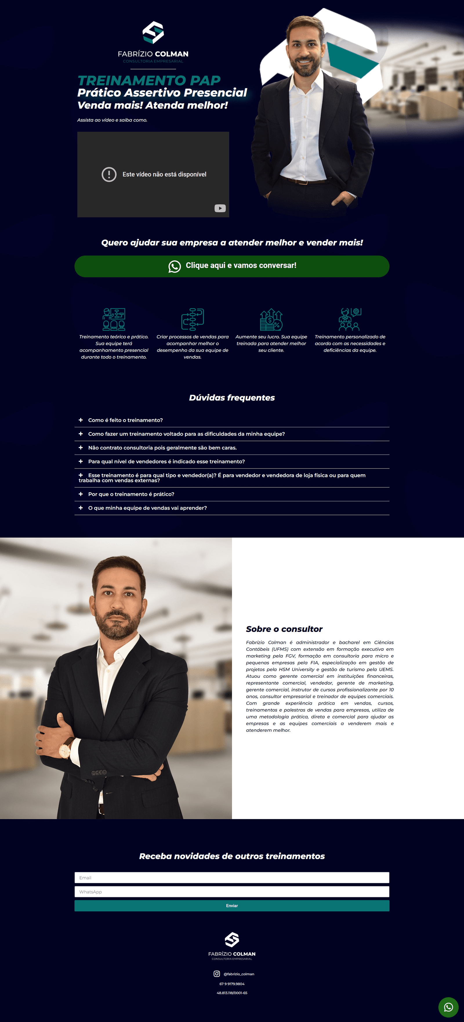 Criação de Landing Page de apresentação para os treinamentos em vendas e performance comercial fornecidos pelo Fabrizio. Página com foco em campanhas de captação de leads.